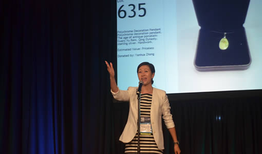 張曉玲上臺后,主持了一條具中國特色的陶瓷項鏈拍品的拍賣。拍品由100美元起拍,在美國助拍ring man的配合下,張曉玲全程使用英文,按照國際慣例,活潑、輕松、幽默地主持了競價。在場美國拍賣同行積極參與出價,經(jīng)過多輪激烈競價,拍品最終由一美國拍賣同行以240美元的價格競得。